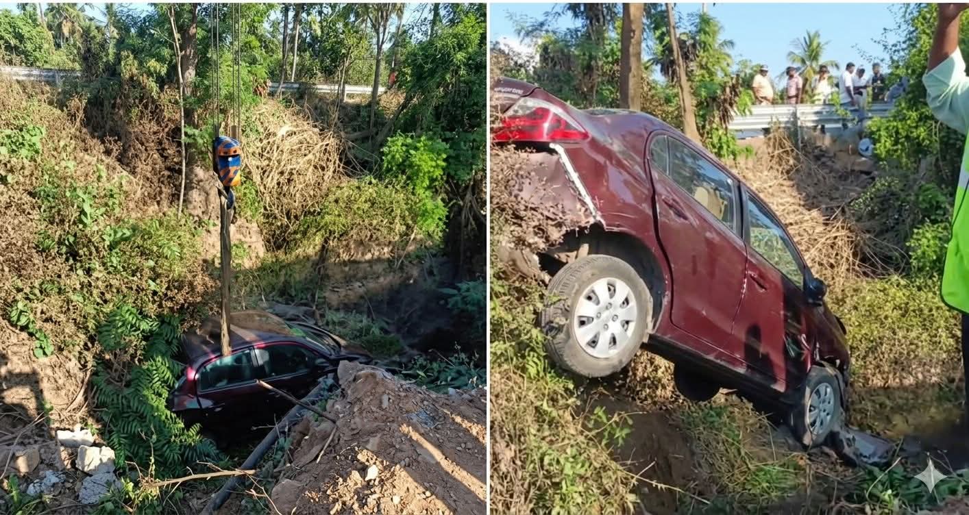 ஆனால், கார் நேரடியாக தண்ணீரில் மூழ்காமல், கிணற்றின் பாதியில் உள்ள கரையில் சிக்கி தொங்கியதால் மிகப்பெரிய உயிரிழப்பு தவிர்க்கப்பட்டது. சம்பவத்தின் போது எழுந்த சத்தத்தை கேட்ட கிணற்றின் உரிமையாளர் மற்றும் அப்பகுதி மக்கள் உடனடியாக சம்பவ இடத்திற்கு விரைந்து வந்து, கிணற்றில் இறங்கி காரில் இருந்தவர்களை பாதுகாப்பாக மீட்டனர்.